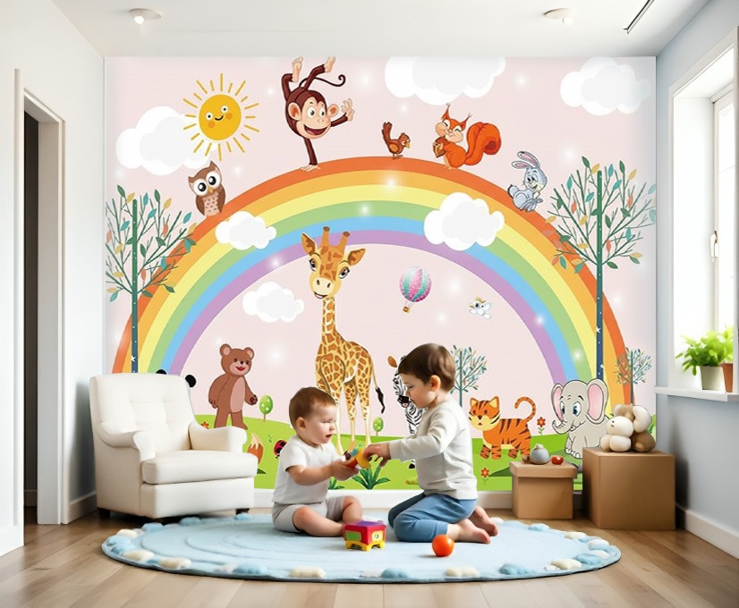 - Bright Rainbow Happy Animals Wallpaper – Cheerful Kids Room Mural