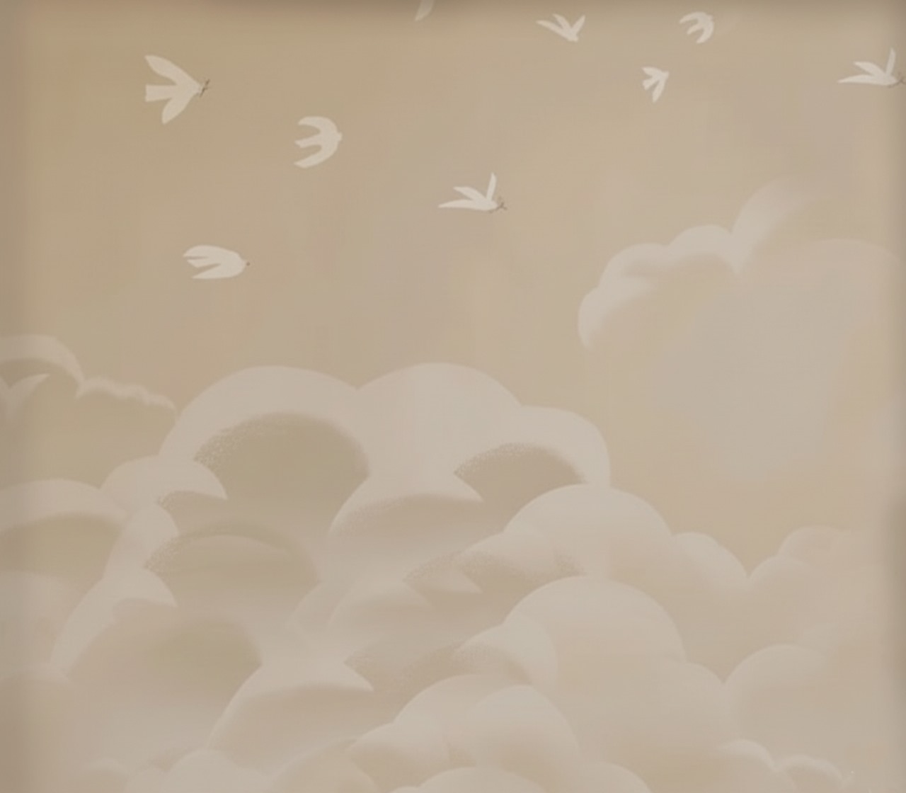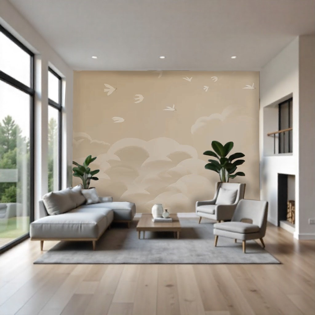 Calm Beige Cloudy Sky Wallpaper – Neutral Flying Birds Mural