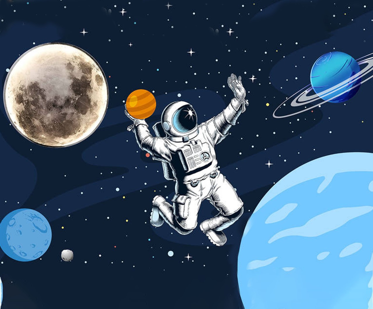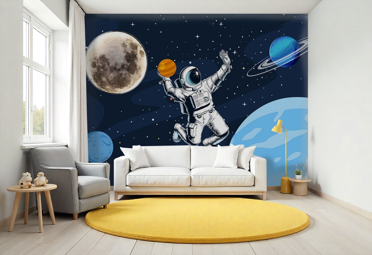 A dynamic and bold space wallpaper featuring a retro-style astronaut playing among the stars, moon, and bright blue planets. With its deep navy blue background and vibrant color pops, this mural is perfect for a teenager’s bedroom, a boy’s room, or an office needing a graphic, cosmic punch. Launch your decor to a new level with this statement piece from Wallchics.