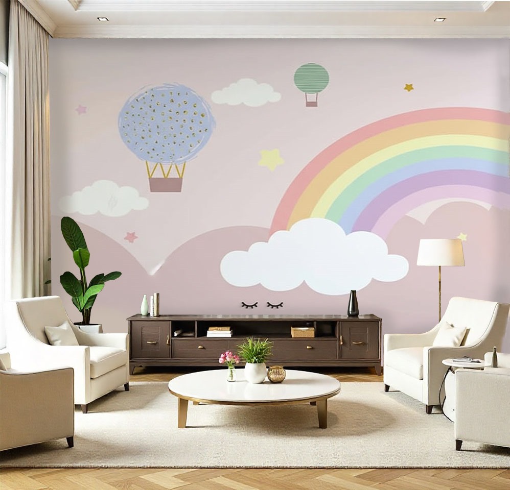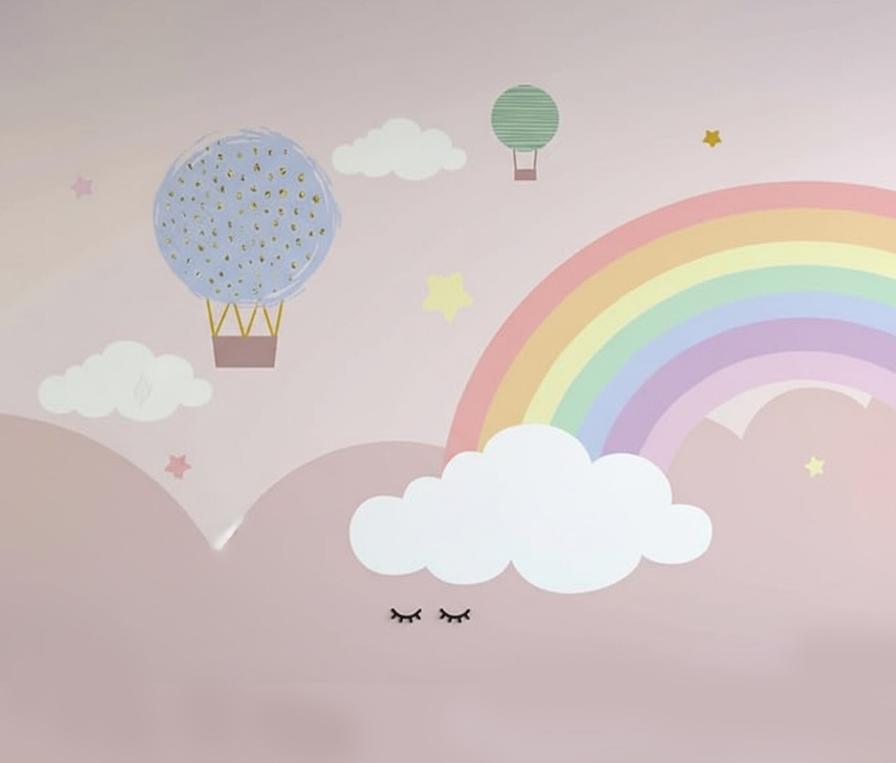 This whimsical and trendy pastel rainbow wallpaper features soft pink clouds with cute sleeping eyelashes and floating hot air balloons with sparkly gold accents. The muted, gentle colors and playful design are perfect for creating a magical, fun nursery or girl’s bedroom. It brings an element of sweet, fantasy-like charm to any space from Wallchics.