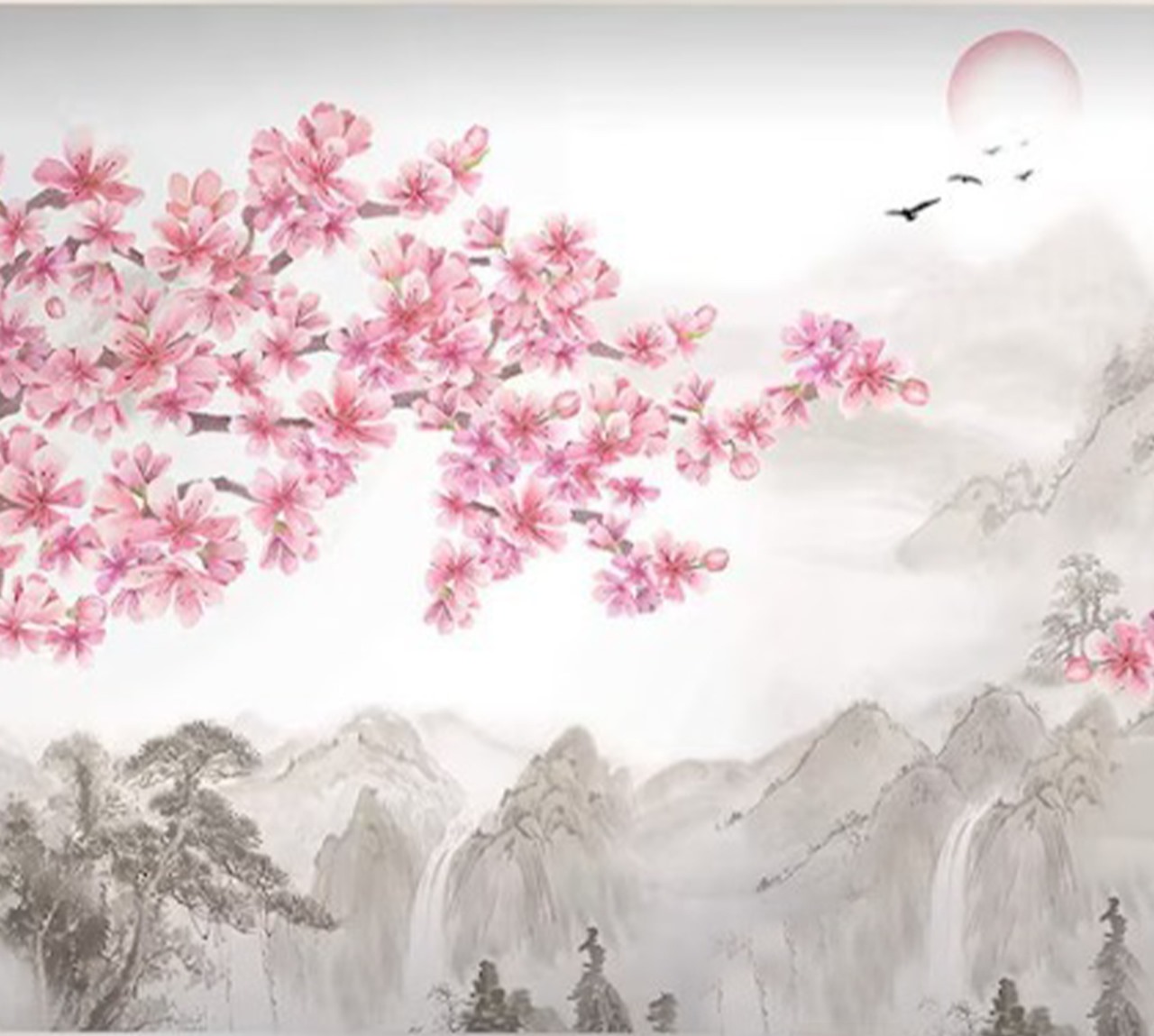 - Elegant Cherry Blossom & Mountain Mural – Asian Ink Wash Style