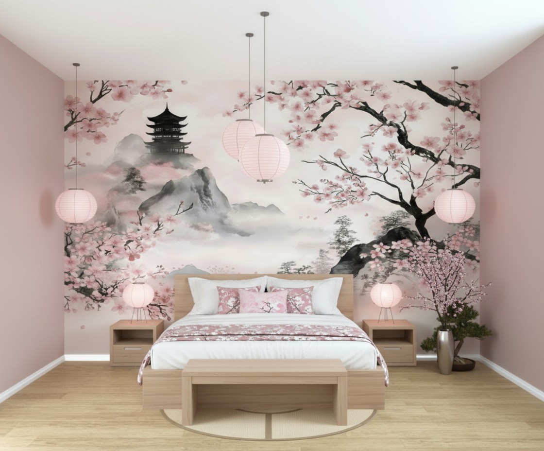 - Misty Asian Cherry Blossom Wallpaper Mural – Pink Pagoda Landscape