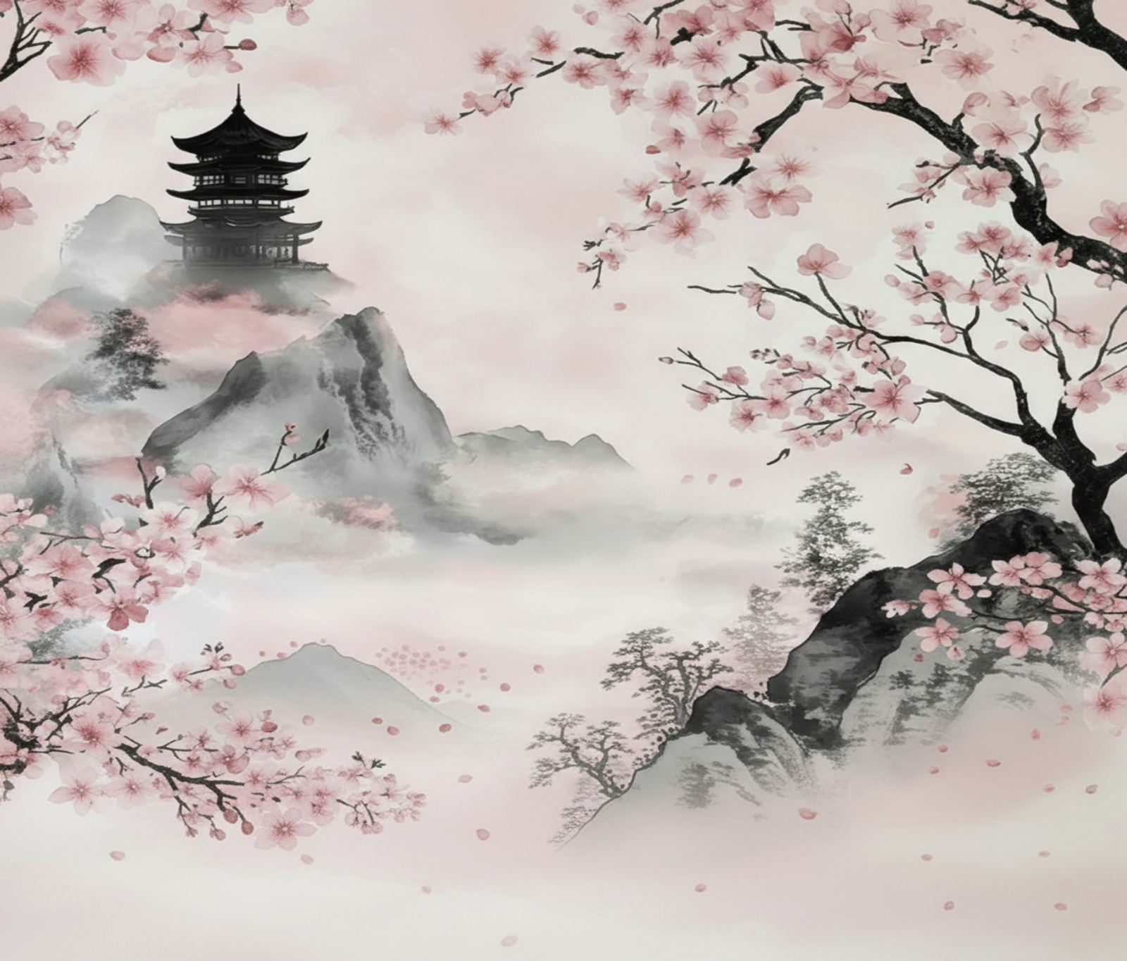 Misty Asian Cherry Blossom Wallpaper Mural – Pink Pagoda Landscape