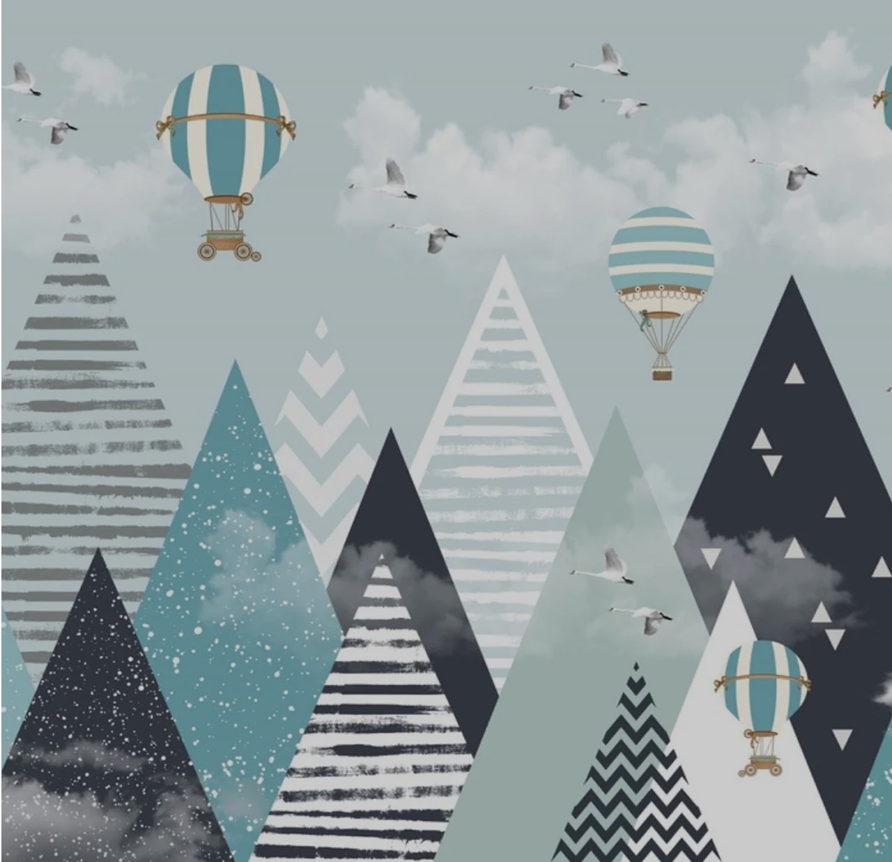 Modern Geometric Mountain Wallpaper – Hot Air Balloon & Swans