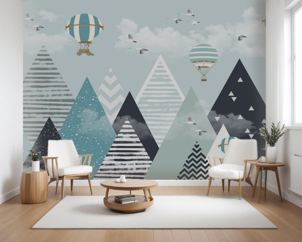 - Modern Geometric Mountain Wallpaper – Hot Air Balloon & Swans