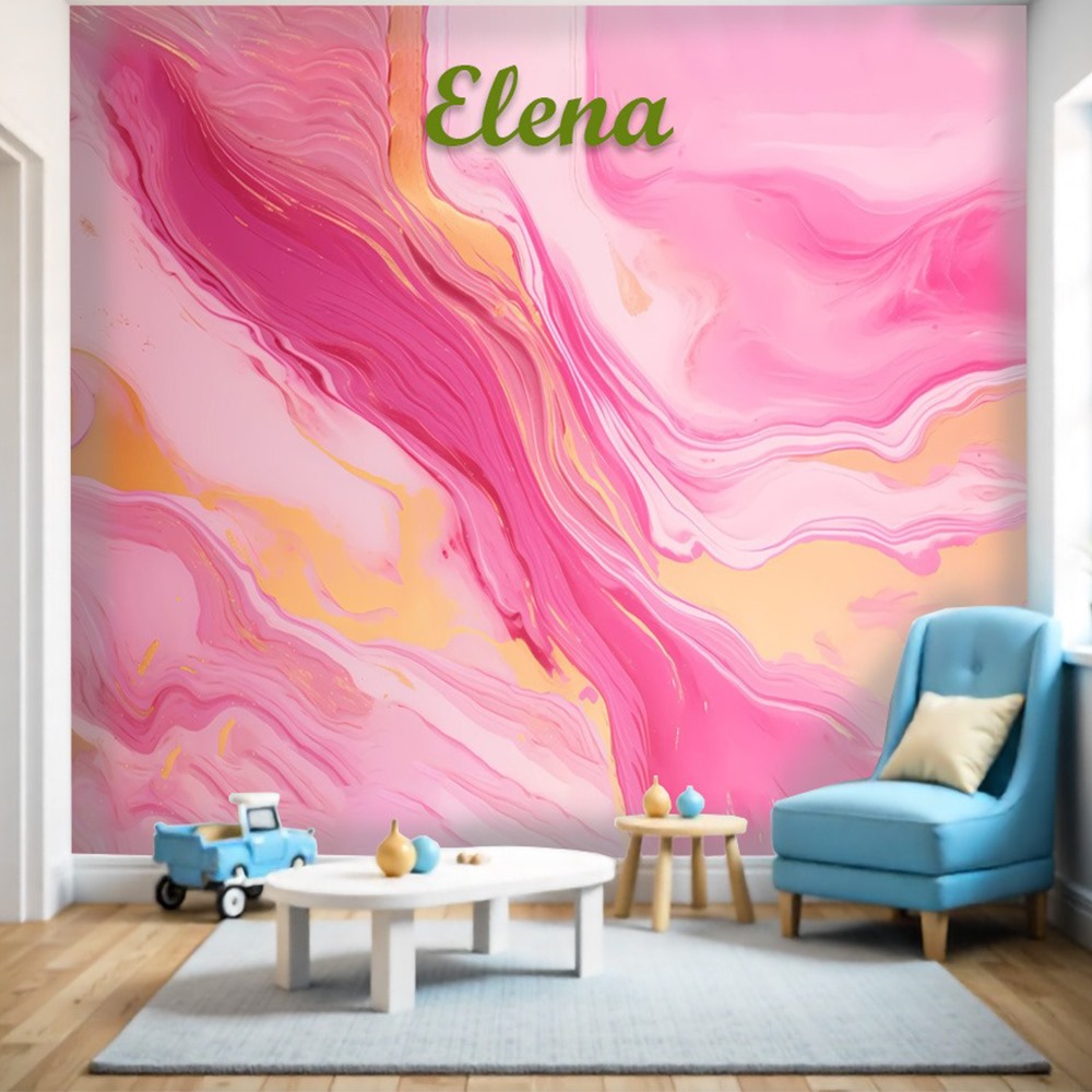 This mural is pure artistic charm. Swirls of pink, peach, and white flow across the wall like marbled paint, creating a dreamy and modern backdrop. At the top, the name ?Elena? is written in green cursive, adding a personal touch and you can customize it with any name you like. The room is cozy and playful, with a small table, a toy car, and a comfy armchair. It?s perfect for a child?s lounge or playroom, offering a stylish space that feels both creative and comforting.