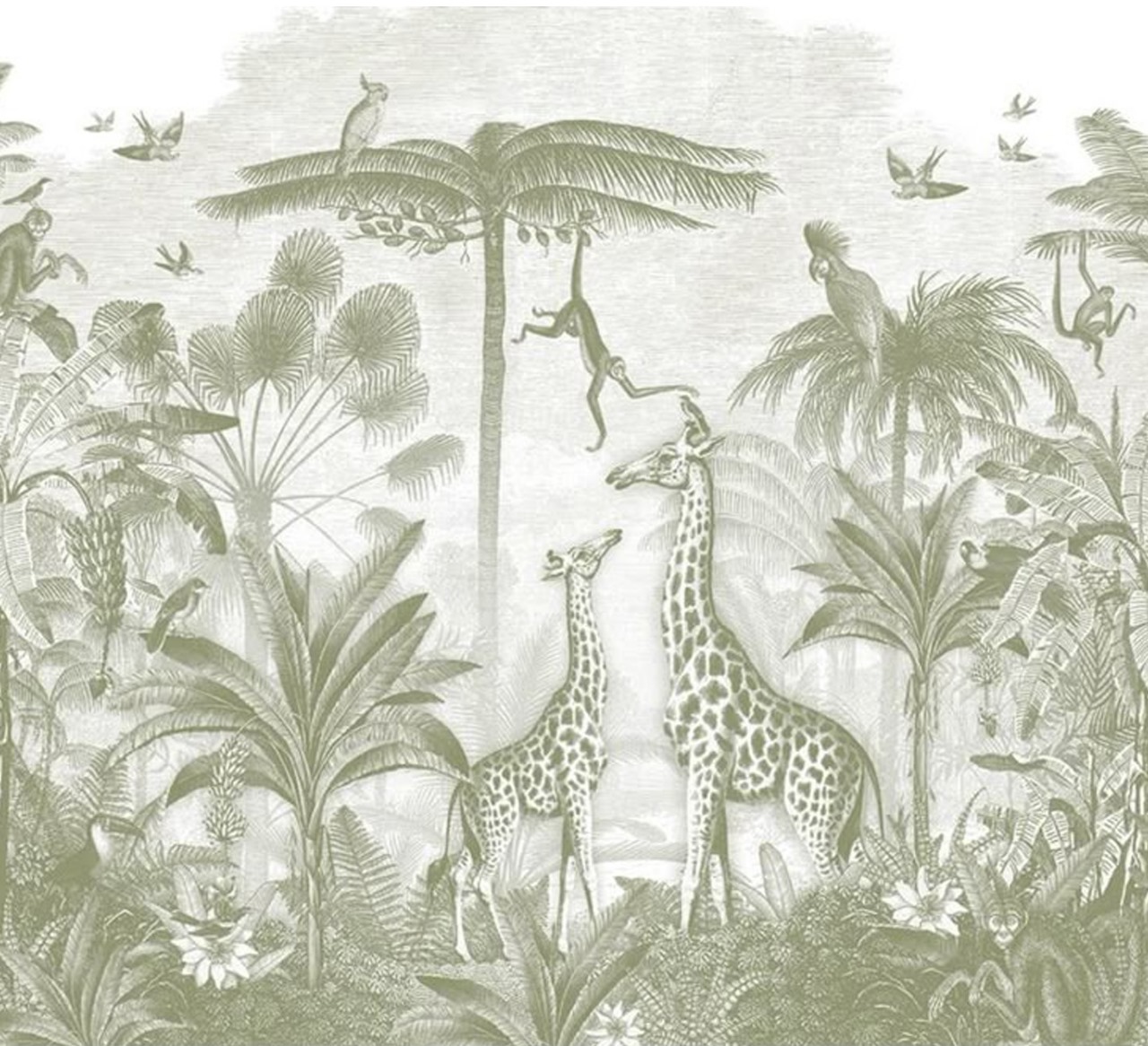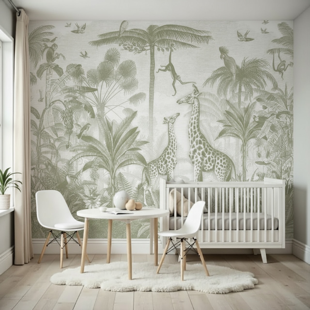 This sophisticated Toile Safari Jungle Mural brings a classic, detailed aesthetic to a tropical theme. Rendered in a stunning vintage sage green monochrome, it features detailed illustrations of giraffes, monkeys, parrots, and exotic foliage. The intricate design and subtle color make it an elegant choice for a sophisticated nursery, study, or feature wall. Discover timeless tropical design with WallChics.