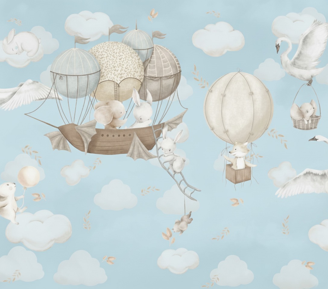 A delightful vintage-style wallpaper featuring cute woodland animals, including bunnies and swans, soaring through a soft blue sky in beautiful steampunk hot air balloons. The whimsical, antique aesthetic is perfect for a gender-neutral nursery, a sophisticated child’s room, or a playful powder room. This charming airborne adventure is brought to you by Wallchics.