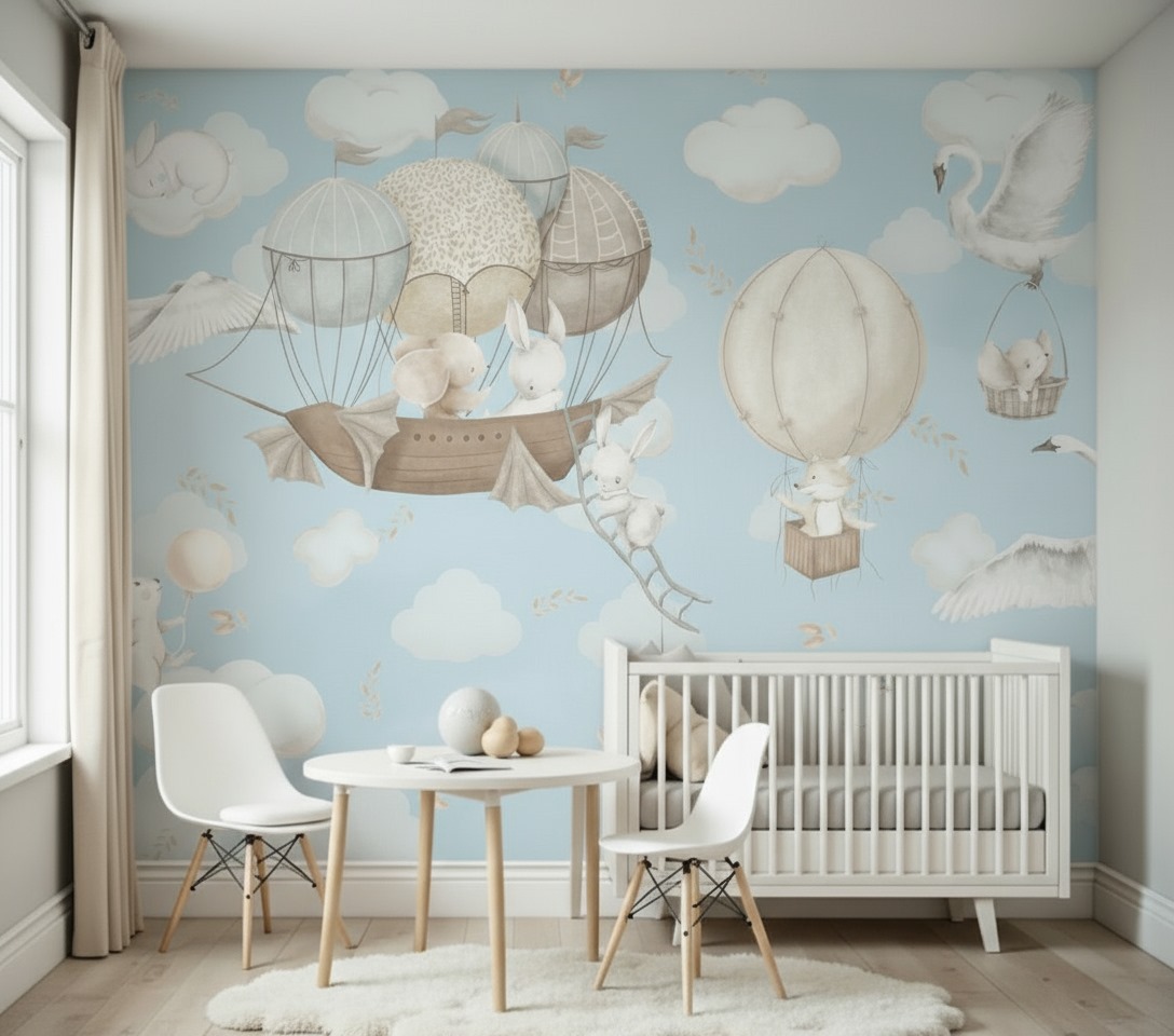 Vintage Hot Air Balloon & Bunny Wallpaper – Blue Sky Nursery Mural