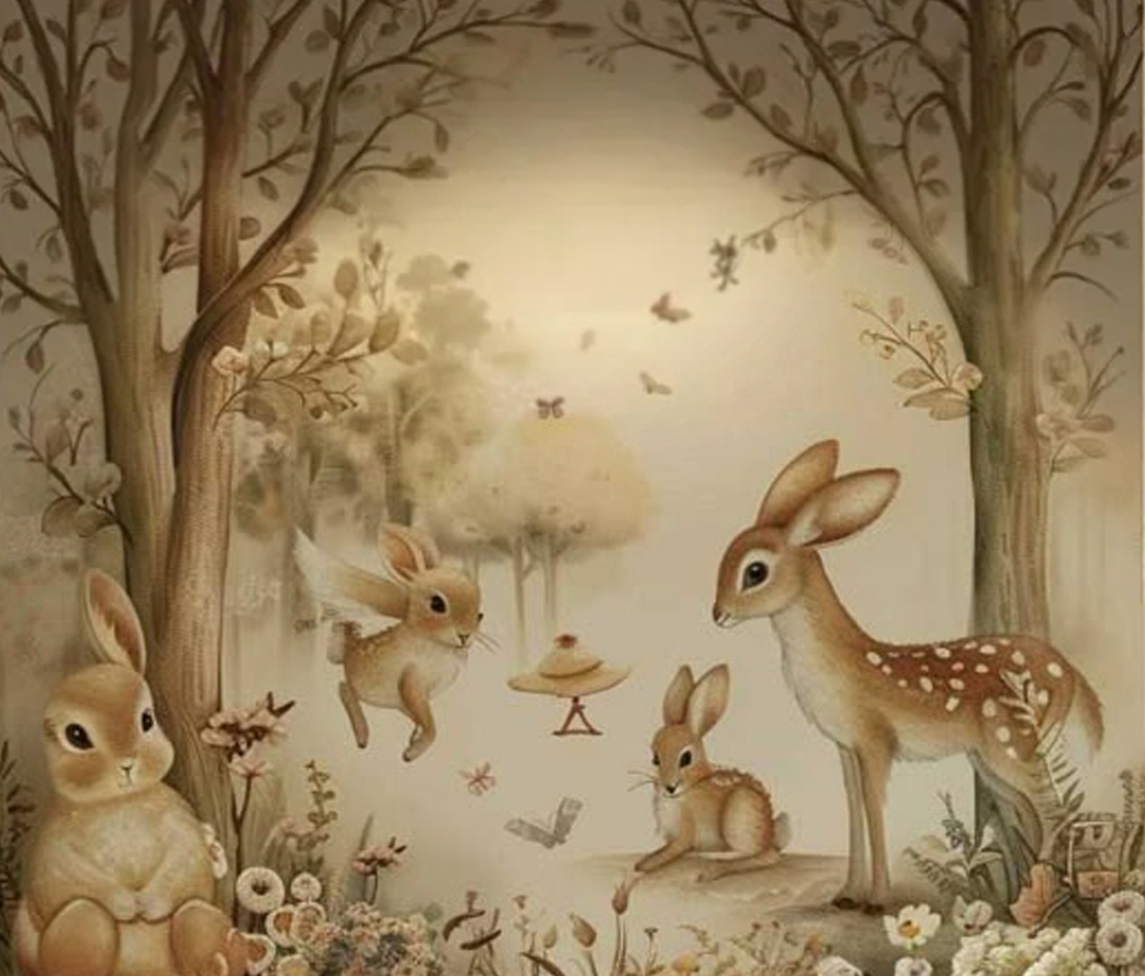 Step into a dreamy, enchanted forest with this charming woodland animal wallpaper. The design features adorable bunnies and deer in a soft, sepia-toned environment, creating a magical, vintage-inspired look. This is the ultimate choice for a cozy, rustic, or fairy-tale-themed nursery or girl’s room. Create a sweet and serene space with this enchanting Wallchics mural.