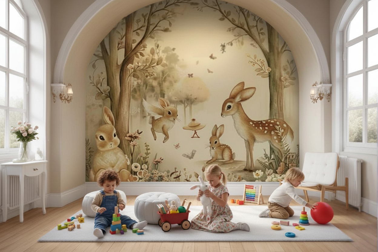 Whimsical Woodland Bunny Deer Wallpaper Mural – Cute Forest Animals